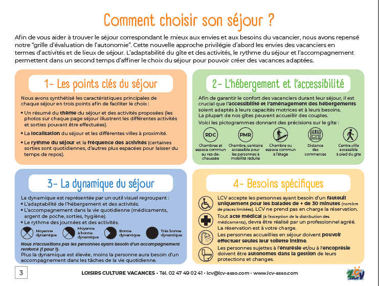 Sur chaque séjour est indiqué plusieurs modalités : le nombre de participants, le moyen de transport, les caractéristiques des chambres (couple, rez-de- chaussée…), la proximité au commerce et la dynamique des séjours. Tous ces items permettent de vous guider dans le choix de séjour, il est donc primordial de les prendre en compte.